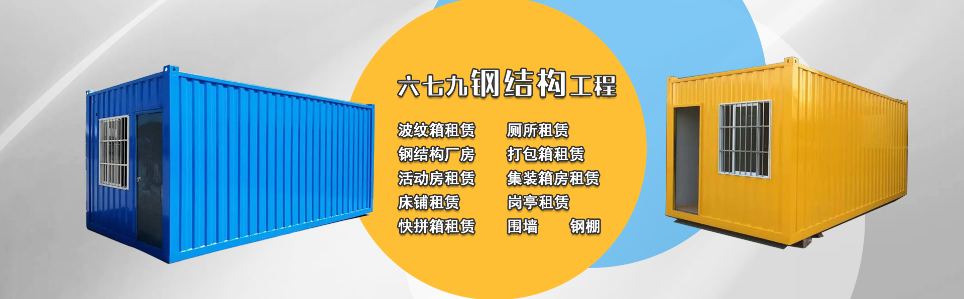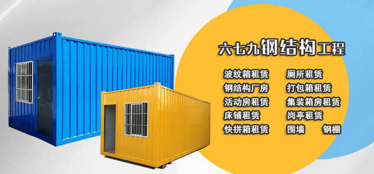 上海六七九钢结构工程有限公司主营产品有:波纹箱租赁、厕所租赁、床铺租赁、打包箱租赁、钢结构厂房、钢棚、岗亭租赁、活动房租赁、集装箱房租赁.、快拼箱租赁、围墙(夹芯板围墙)等,我们还可以根据客户要求个性化定制。公司凭借其品种齐全、低廉租费等多种优势,深受各行业客户的欢迎。